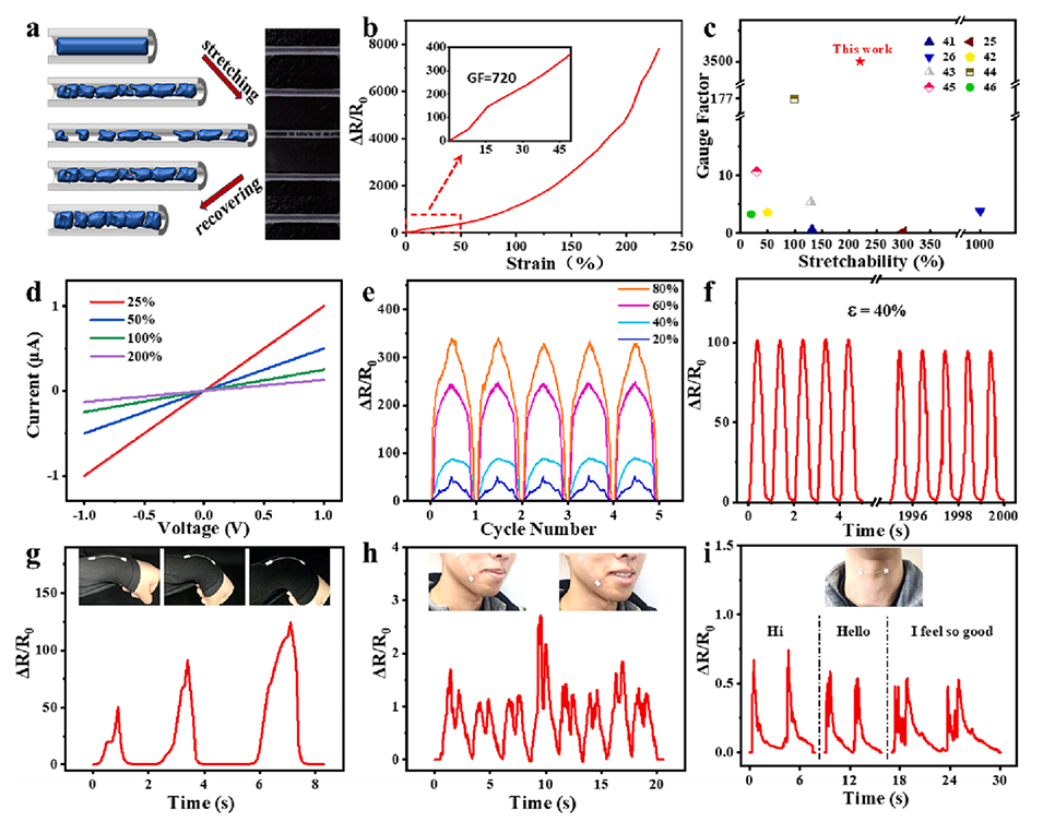 图3.基于PU@PEDOT:PSS纤维的应变传感器的机电行为及应用。