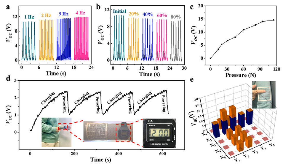 图4.基于PU@PEDOT:PSS纤维的F-TENG的电输出性能及其在可穿戴能量收集和空间压力分布检测中的应用。