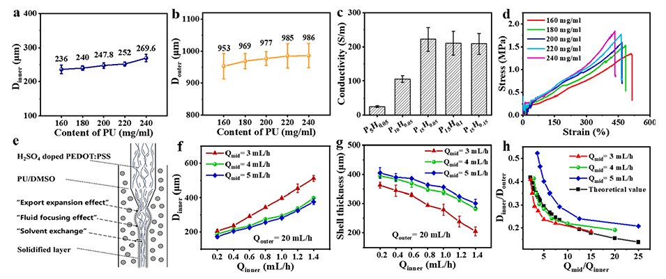 图2.(a)当PU/DMSO鞘液中具有不同PU含量时,PU@PEDOT:PSS纤维的内径和(b)外径。(c)具有不同内部流体成分的PU@PEDOT:PSS纤维的核心电导率。(d)当PU/DMSO鞘液中具有不同PU含量时,PU@PEDOT:PSS纤维的应力-应变曲线。(e)流体凝固效果示意图。(f)PU@PEDOT:PSS纤维内径与内部和中间流体的流速之间的关系(外部流体的固定流速为20mL/h)。(g)PU@PEDOT:PSS纤维的壳厚与内部和中间流体的流速之间的关系(外部流体的固定流速为20mL/h)。(h)Dinner/Douter-Qmid/Qinner曲线。