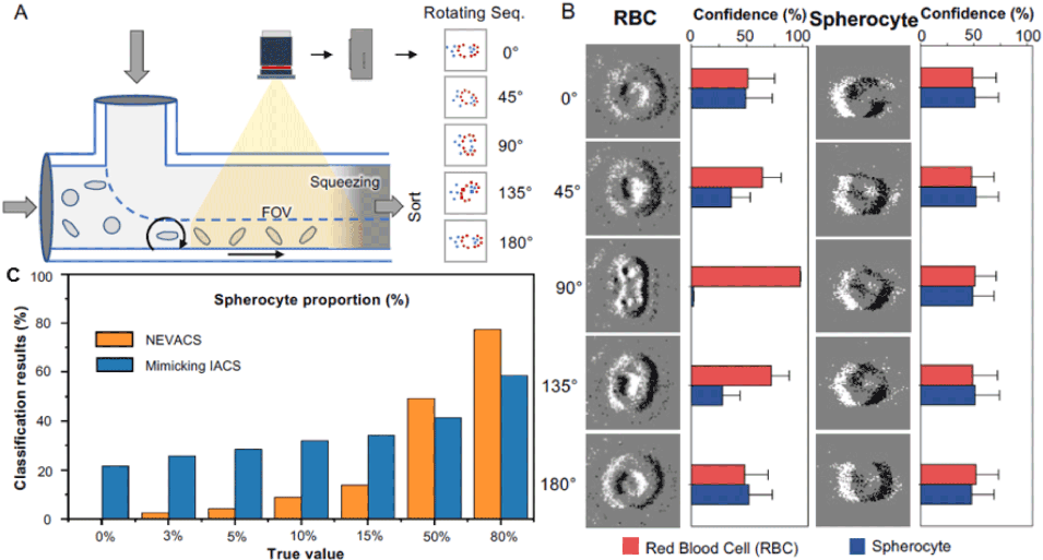 对于遗传性球形红细胞增多症或自身免疫性溶血性贫血患者,球形红细胞比例超过15%,而健康成人<3%。为了证明神经形态视频流式细胞仪的优势,混合常规红细胞和球形红细胞的样品导入微流控芯片中,通过垂直鞘液使细胞向前翻滚。细胞的视频包括其多角度成像,可输入神经形态视频流式细胞仪中进行细胞分类。为了比较,从视频中随机选择包含细胞完整外观的单帧图像,以模仿传统成像流式细胞仪的单帧图像激活分选控制。传统成像流式细胞仪中的单帧图像激活分类由于健康红细胞的盘状形态而容易受到不同角度的影响,造成较大错误。本研究使用视频和模拟的单帧图像对混合细胞样本进行检测,平均错误率分别为0.99%和19.93%,这表明NEVACS在血细胞形态学筛查和血液疾病诊断中的应用潜力。