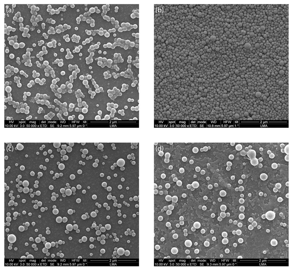图2.在(a)5 W、(b)10 W、(c)15 W和(d)20 W的超声功率下合成的空白PLGA纳米颗粒的代表性SEM图像。超声微反应器在48 kHz的频率下运行。PLGA浓度为12 mg mL-1。