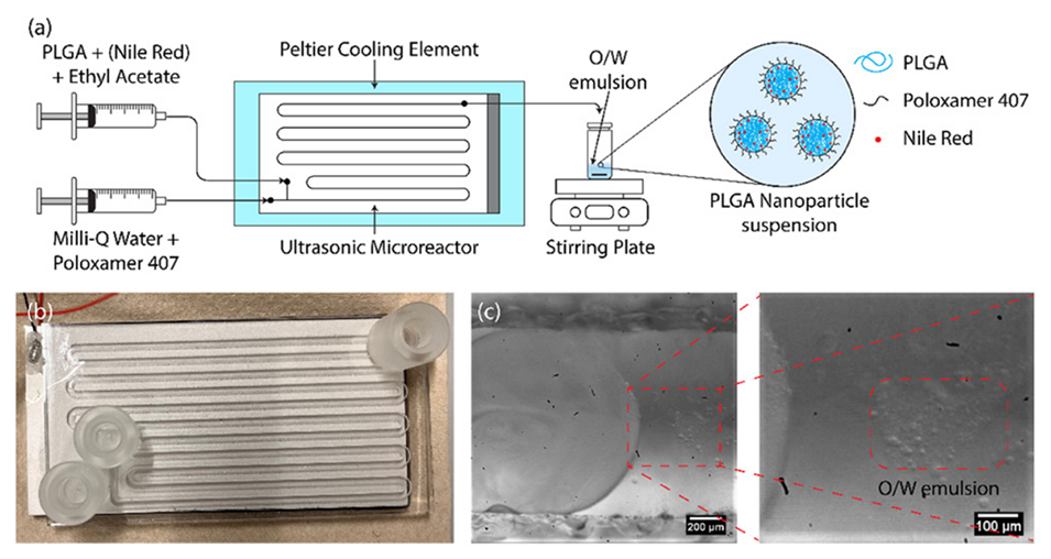 图1.(a)(尼罗红负载)PLGA纳米颗粒的合成步骤示意图,(b)超声微反应器,(c)超声驱动下微通道中生成的O/W乳液。