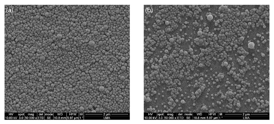 图3.在48 kHz和10 W的超声频率和功率下合成的(a)空白PLGA纳米粒子和(b)负载尼罗红的PLGA纳米粒子的代表性SEM图像。