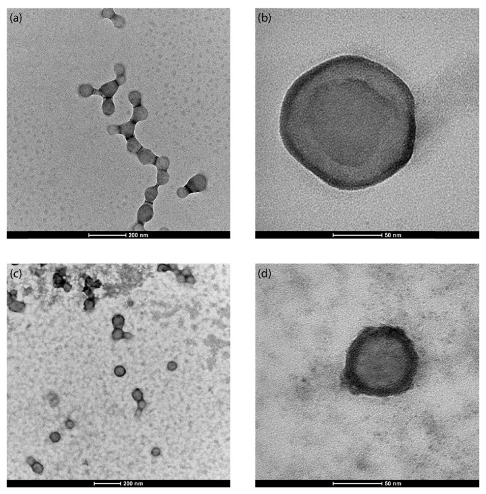 图4.在48 kHz和10 W的超声频率和功率下合成的(a-b)空白PLGA纳米粒子和(c-d)负载尼罗红的PLGA纳米粒子的代表性TEM图像。