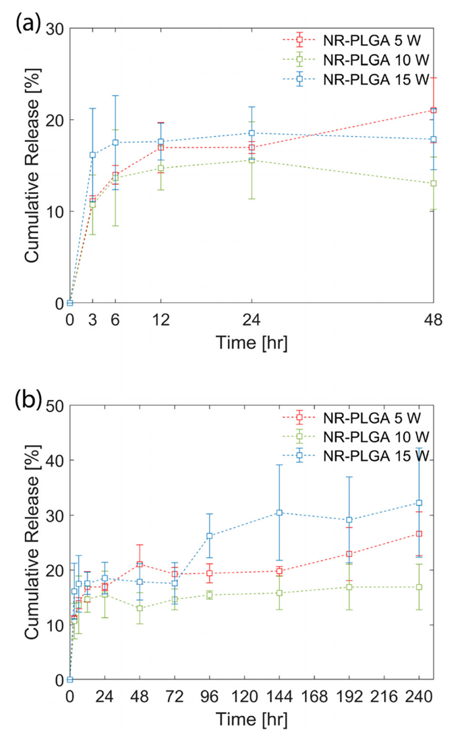 图5.在5 W、10 W和15 W的超声功率下合成的NR-PLGA纳米颗粒的体外释放曲线。(a)前48小时的释放曲线和(b)240小时的释放曲线。
