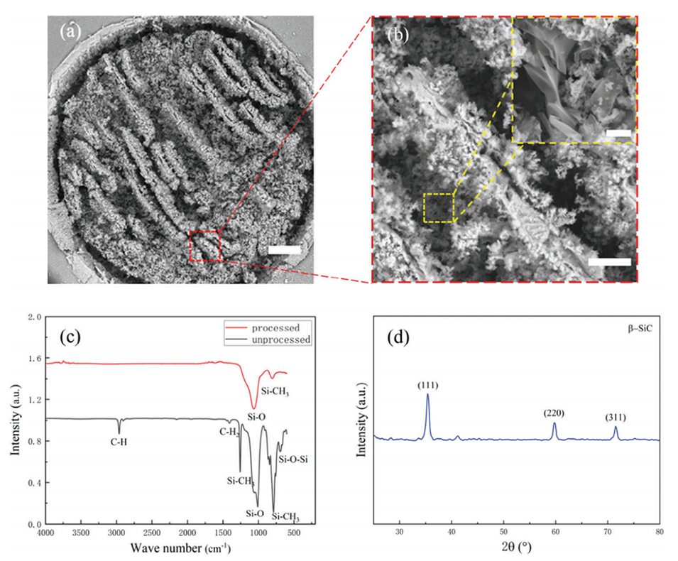 图2.a)通过紫外纳秒激光在碳纳米管掺杂的PDMS片基板上形成的HPCR的SEM形貌,比例尺:100μm;b)图2a中红色虚线框的放大微观形貌,比例尺:20μm。右上角是黄色虚线框的放大图,比例尺:6μm;c)FTIR光谱分析结果,红线为紫外纳秒激光处理后的样品,黑线为未处理的样品;d)碳掺杂PDMS经紫外纳秒激光处理形成的高光热转换区的XRD分析结果。