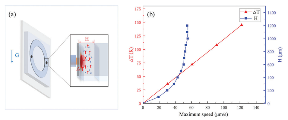 图3.a)激光照射HPCR期间微通道中液体和粒子运动的示意图;b)局部热梯度运动的模拟。(红线:激光功率密度为1.5915、3.183、4.7745、6.366μW μm-2时,通道深度为300μm时,微通道中液体的最大流速;蓝线:温差为30K时,深度范围为100-1200μm的微通道中的最大流速)。