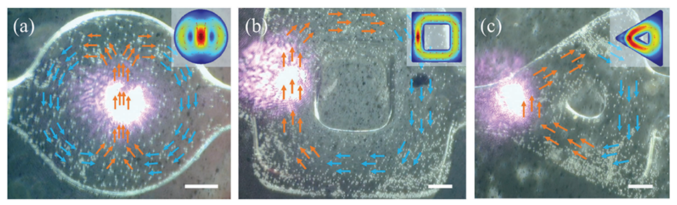 图5.激光照射过程中液体和颗粒的流动方向。a)圆形微通道;b)方形微通道;c)三角形微通道。右上角的插图显示了一个模拟实验。所有比例尺均为200μm。