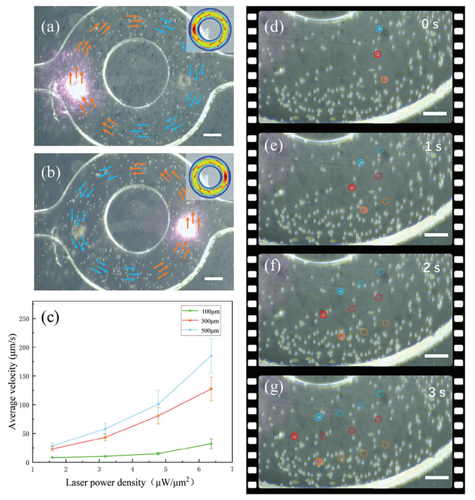 图4.a)左侧为激光照射HPCR期间粒子的运动,右上角为二维液体流动模拟。比例尺:200μm;b)右侧为激光照射HPCR期间粒子的运动,右上角为二维液体流动模拟。比例尺:200μm;c)在不同条件下测量了微通道内颗粒的平均速度,通道深度为100、300和500μm,激光功率密度为1.5915、3.183、4.7745、6.366μW μm-2;d–g)显示了在300μm深度的环形微通道中,用6.366μW μm-2激光功率密度的激光照射微通道中的三个粒子0–3秒的运动图像,实线圈为粒子的当前位置,虚线圈为先前位置。比例尺:100μm。
