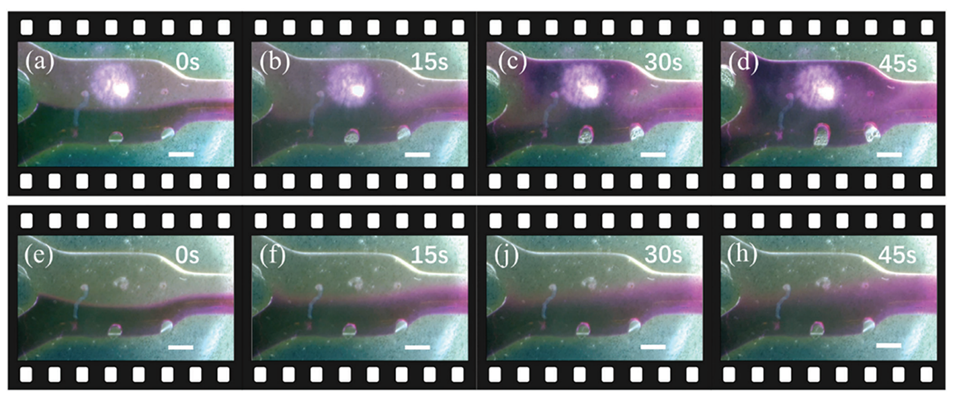 图6.a–d)在波长为1064nm、功率密度为3.183μW μm-2的激光照射下,水和罗丹明溶液在微通道中的混合情况,混合时间为0–45s;e–h)在无激光照射的情况下,水和罗丹明溶液在微通道中的混合情况,混合时间同样为0–45s。所有标尺均为500μm。