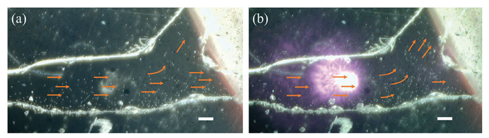图7.聚苯乙烯微球分流,橙色箭头表示流体运动方向。a)无激光照射;b)通过激光照射。所有比例尺均为200μm。