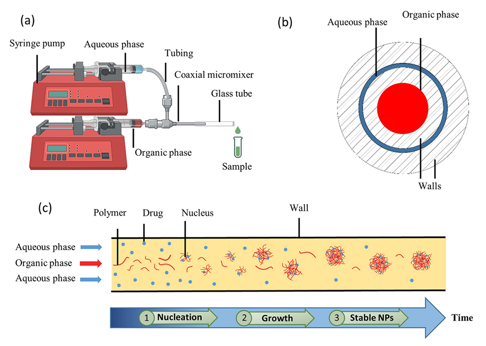 图1.(a)微流体装置的示意图,(b)微混合器的横截面,(c)通过微混合器形成PLGA NPs的过程。