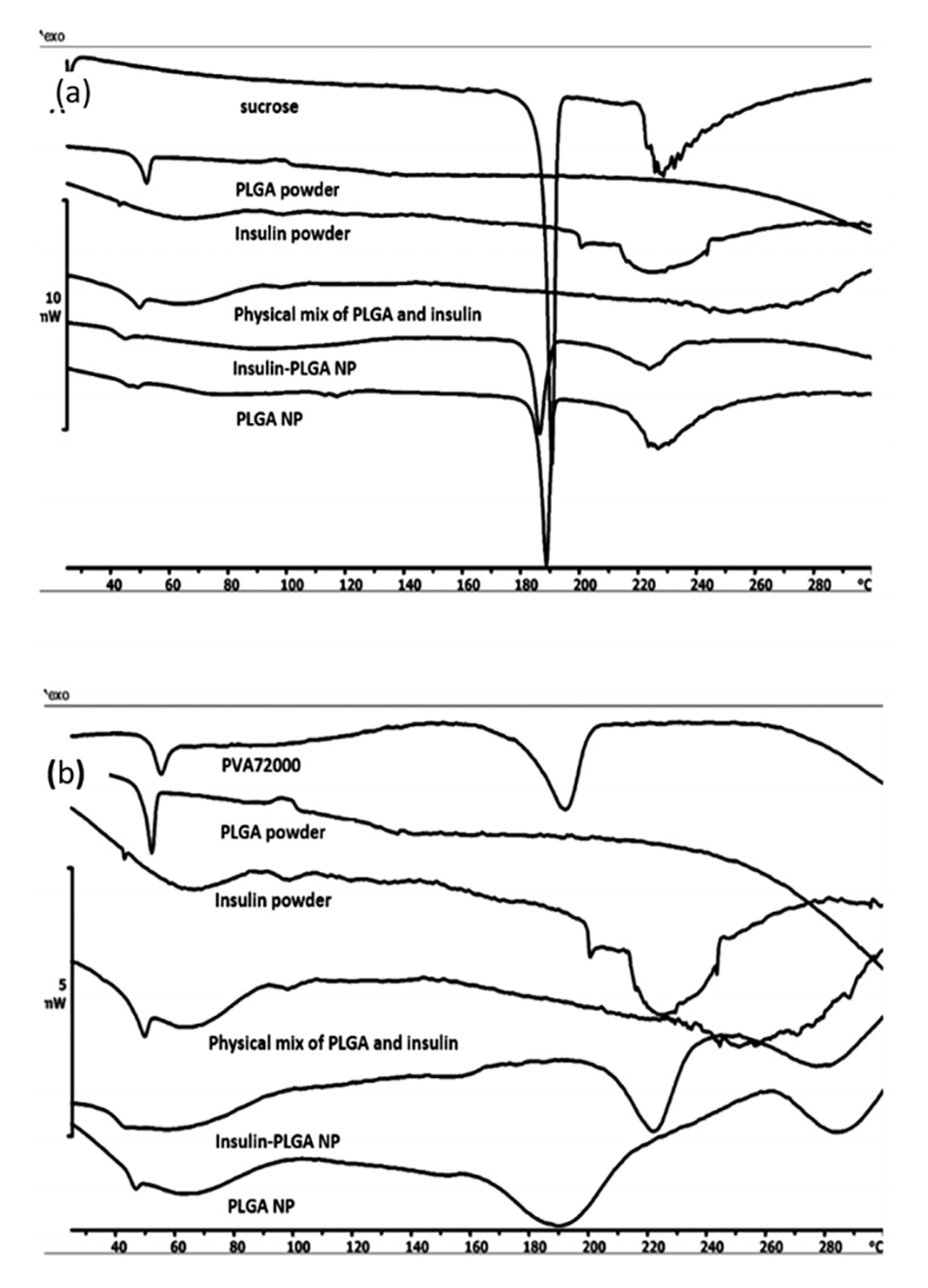 图3.(a)通过微流体方法在有和没有胰岛素的情况下制备的NPs以及原料的DSC热谱图,(b)通过DESE法在有或没有胰岛素的情况下制备的NPs以及原料的DSC热谱图。