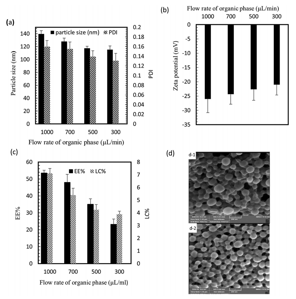 图2.有机相流速对(a)粒径和PDI,(b)ζ电位,(c)包封效率和负载量的影响(平均值±标准差,n=3)。通过(d-1)微流体方法、(d-2)DESE方法合成的NPs的FE-SEM图像。