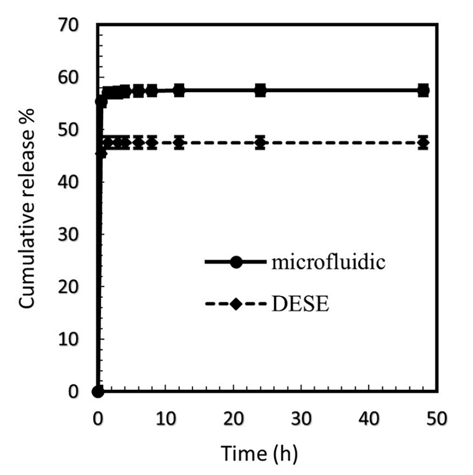 图5.通过微流体和DESE方法制备的NPs的累积释放曲线(平均值±标准差,n=3)。