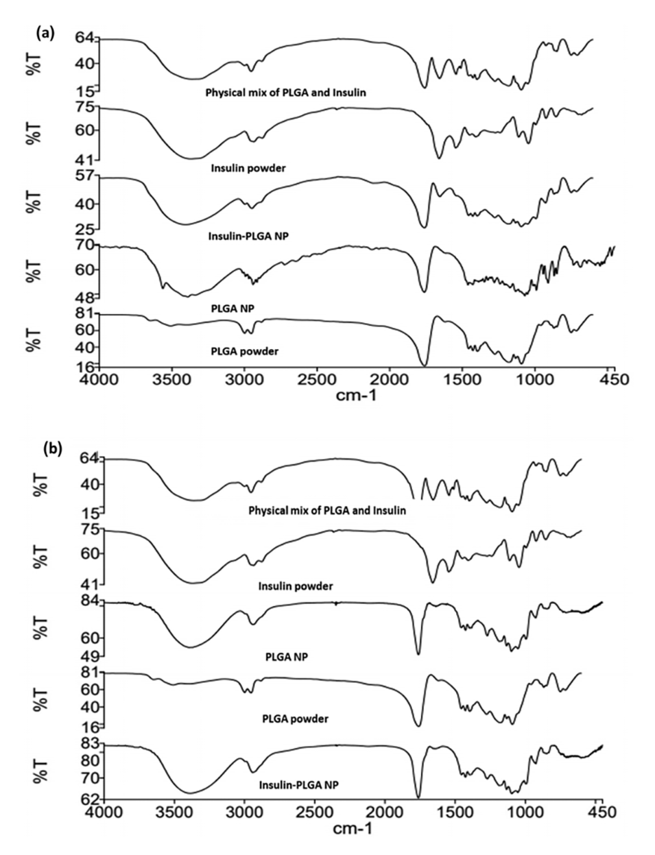 图4.(a)通过微流体方法在有和没有胰岛素的情况下制备的NPs以及原料的FT-IR光谱,(b)通过DESE法在有或没有胰岛素的情况下制备的NPs以及原料的FT-IR光谱。