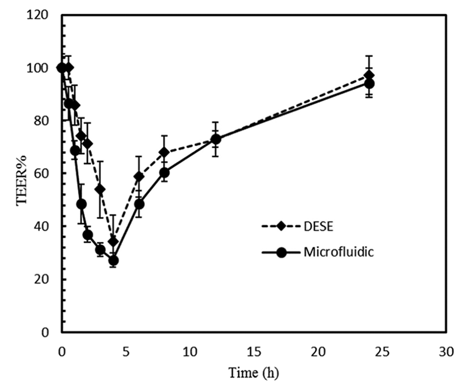 图7.通过微流体和DESE方法制备的NPs的TEER(跨上皮细胞电阻)值(平均值±标准差,n=3)。
