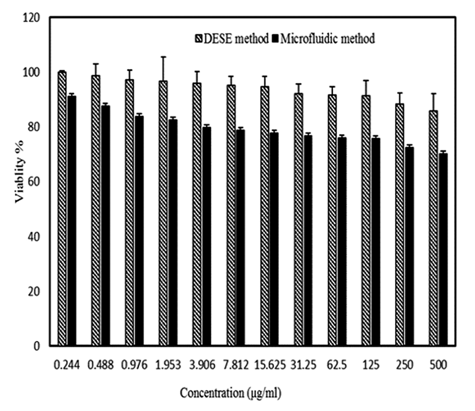 图6.通过微流体和DESE方法制备的NPs的MTT分析(平均值±标准差,n=3)。