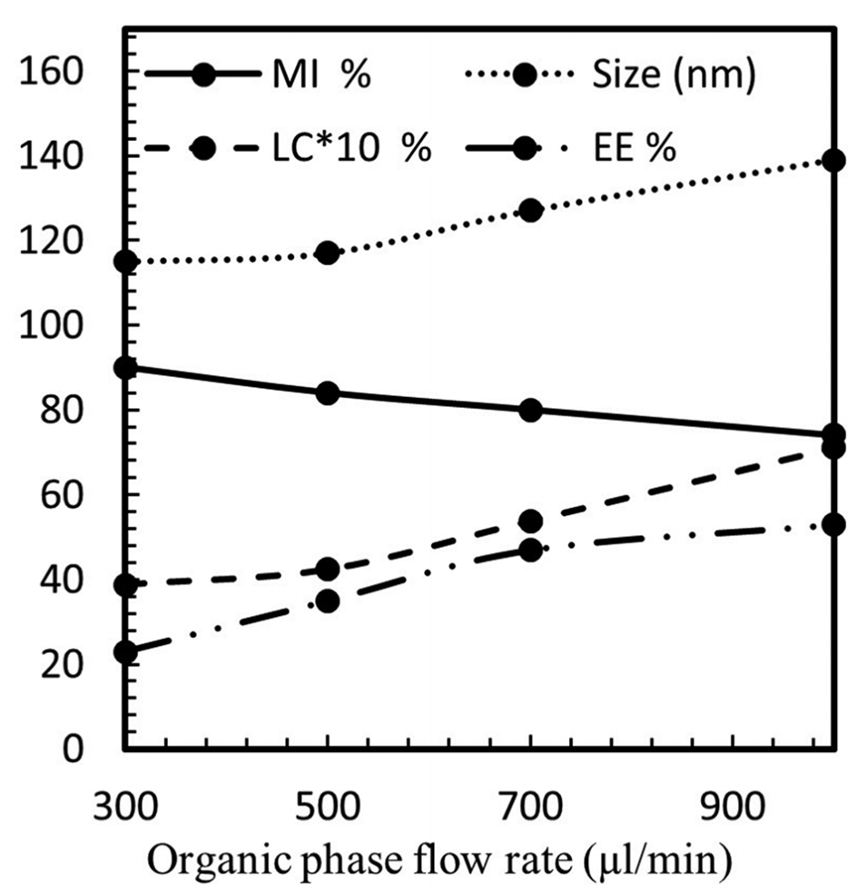 图8.有机相流速对混合指数(MI)、粒径、负载量(LC)和包封效率(EE%)的影响。