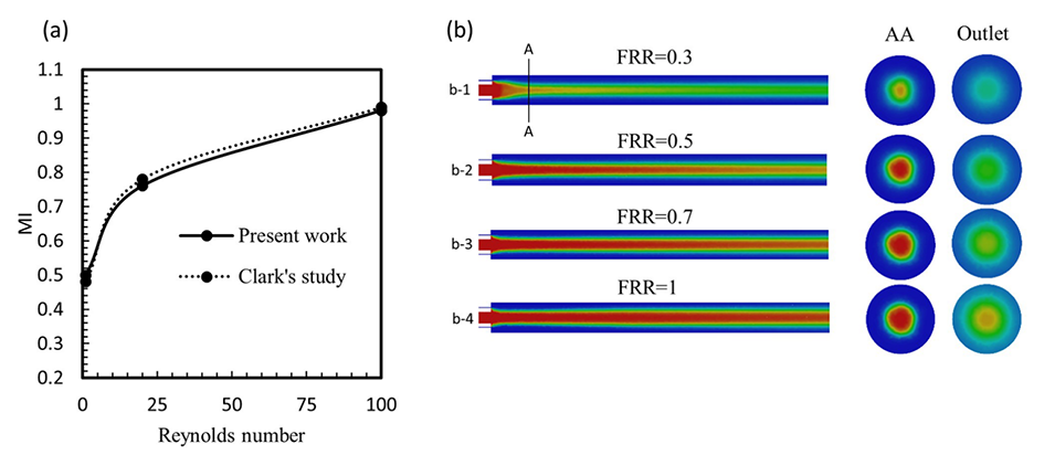 4、数值模拟表明,降低有机相与水相的流速比可改善混合效果。