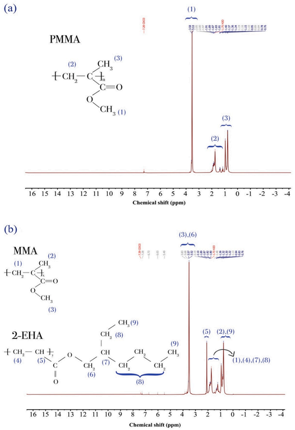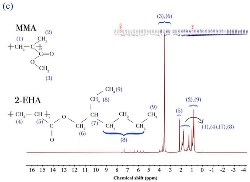 图1.(a)PMMA-L、(b)MMA/EHA(10)和(c)MMA/EHA(20)共聚物的1H NMR光谱。