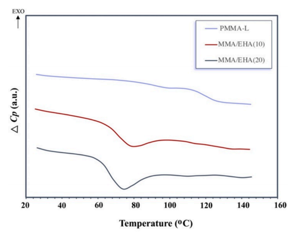 图2.PMMA-L和MMA/EHA(10)和MMA/EHA(20)共聚物的DSC曲线。