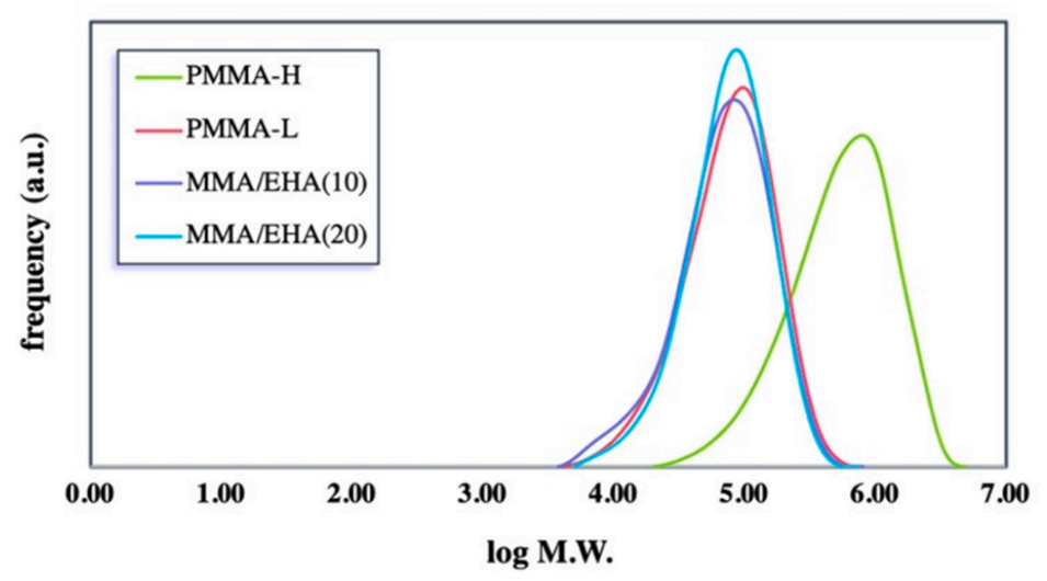 图3.PMMA-H、PMMA-L、MMA/EHA(10)和MMA/EHB(20)的分子量分布。