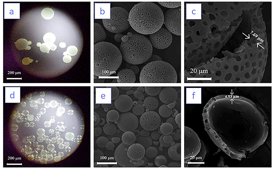 图7.(a)M/E10-1.5和(d)M/E20-1.5微胶囊的OM图像,完整的(b)M/E10-1.5和(e)M/E20-1.5微胶囊的SEM图像,以及在液氮中破碎后(c)M/E10-1.5和(f)M/E20-2.5微胶囊的不同放大倍数SEM图像。