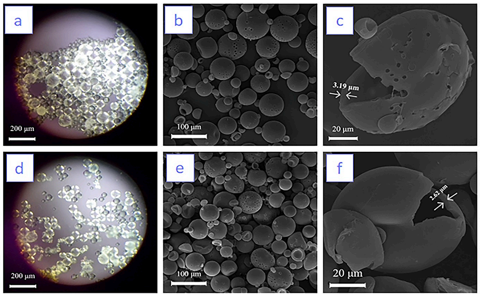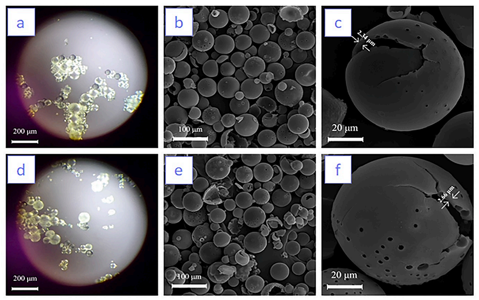 图5.(a)ML-1.5和(d)ML-2.0微胶囊的OM图像,完整的(b)ML-1.5.和(e)ML-2.0.微胶囊的SEM图像,以及在液氮中破碎后(c)ML-1.5和(f)ML-2.0微胶囊的不同放大倍数SEM图像。