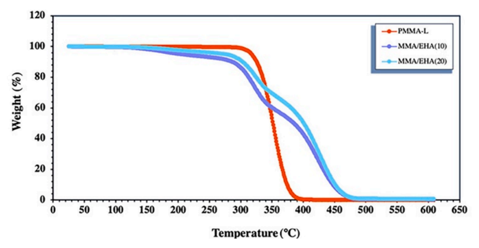 图8.PMMA-L均聚物、MMA/EHA(10)和MMA/EHA(20)共聚物的TGA曲线。