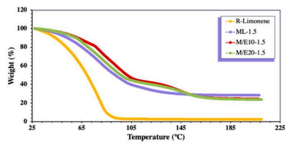 图9.R-柠檬烯和载香微胶囊样品的TGA曲线。