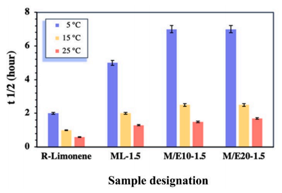 图11.不同温度下未加载的R-柠檬烯样品和加载的微胶囊的等温香料释放半衰期。