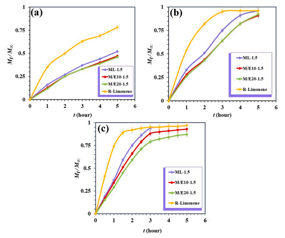 图10.在(a)5℃、(b)15℃和(C)25℃的温度下,纯香料和不同载香聚合物微胶囊的香料释放曲线。