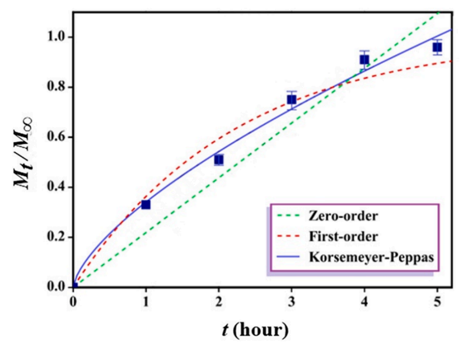 图12.ML-1.5样品在15℃下的释放曲线以及零阶、一阶、Korsmeyer-Peppas和Baker-Londsdale模型的相应拟合。