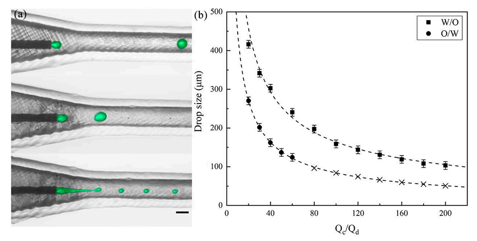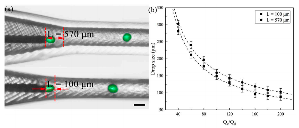 3、调节连续相和分散相的流量比。通过调节连续相和分散相的流量比,可以显著改变产生的液滴尺寸。随着流量比的增加,液滴尺寸会逐渐减小。