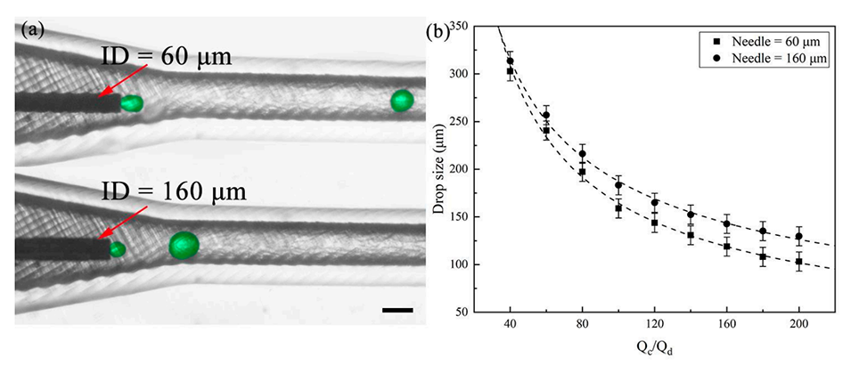 3、灵活调节液滴尺寸:通过更换不同尺寸的针头或调节针头在收敛通道中的位置,可以灵活调节产生的液滴尺寸,满足不同应用需求。