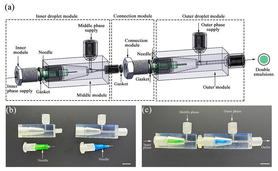 1、本研究开发了一种模块化且具有成本效益的液滴微流控装置,用于控制复杂乳液的生成,包括油水单乳液和具有不同数量封装液滴的双乳液。