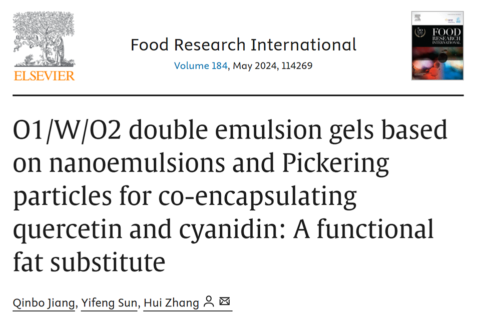 近期,浙江大学张辉教授课题组采用两步乳化法制备了一种基于纳米乳液和疏水性Pickering颗粒的O1/W/O2双乳液凝胶,该双乳液凝胶能够共包封疏水性槲皮素和亲水性花青素,作为一种功能性脂肪替代品,具有重要的应用前景。相关研究以“O1/W/O2 double emulsion gels based on nanoemulsions and Pickering particles for co-encapsulating quercetin and cyanidin: A functional fat substitute”为题目,发表在期刊《Food Research International》上。