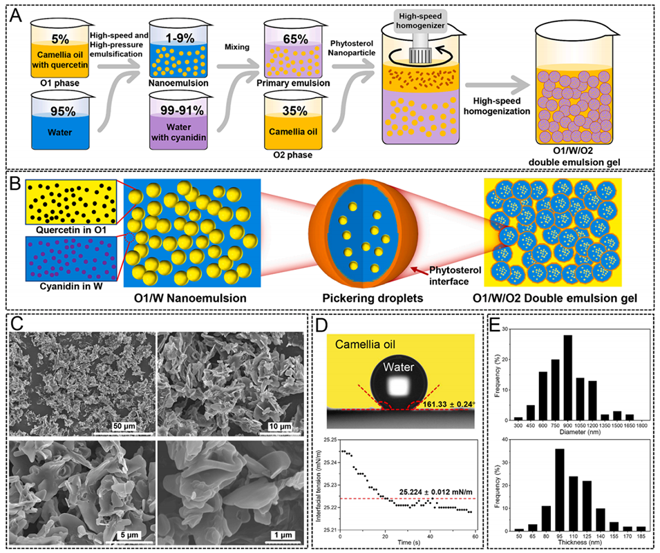 图1.双乳液凝胶制备示意图(A);多级结构双乳液凝胶示意图(B);植物甾醇纳米颗粒的SEM显微照片(C);植物甾醇纳米颗粒的三相接触角和山茶油与水之间的界面张力(D);植物甾醇纳米颗粒的等效直径和厚度(E)。