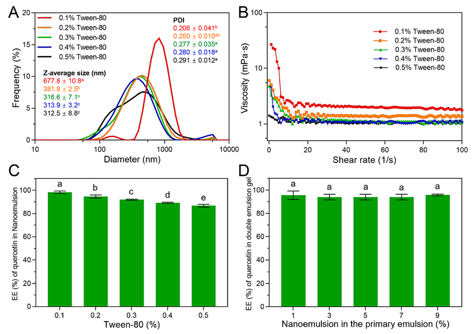 图2.由Tween-80(0.1%至0.5%)制备的纳米乳液的强度加权尺寸分布、PDI(A)和粘度(B);由Tween-80(0.1%至0.5%)制备的纳米乳液中槲皮素的EE(C);在初级乳液中加入1%至9%的纳米乳液(由0.3%Tween-80稳定)制备的双乳液凝胶中槲皮素的EE(D)。