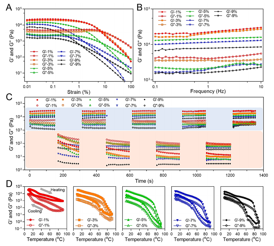 图3.在初级乳液中加入1%至9%的纳米乳液制备的双乳液凝胶的应变扫描(A)、频率扫描(B)、时间扫描(C)和温度扫描(D)数据。时间扫描中的蓝色区域和红色区域分别表示应变为0.1%和100%。