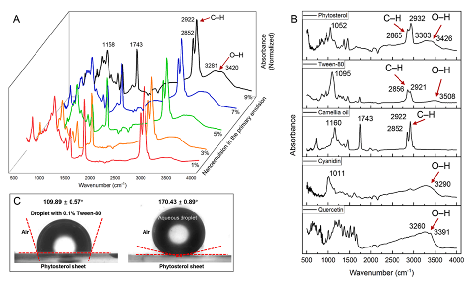 图6.冻干双乳液凝胶的FTIR光谱(归一化)(A);植物甾醇、Tween-80、山茶油、花青素和槲皮素的FTIR光谱(B);添加和不添加Tween-80时植物甾醇、空气和水的三相接触角(C)。