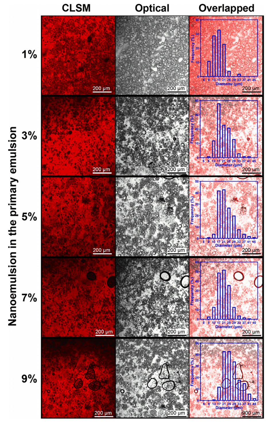 图4.双乳液凝胶的CLSM、光学和重叠显微照片;插图是双乳液凝胶的尺寸分布。