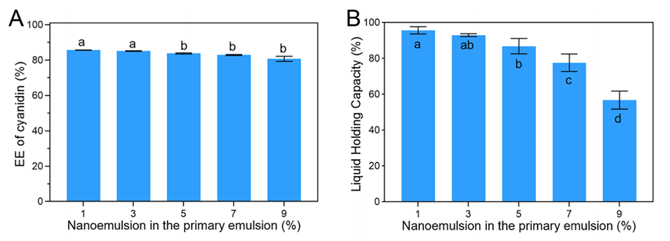 图5.在初级乳液中加入1%-9%的纳米乳液制备的双乳液凝胶的花青素(A)和LHC(B)EE。