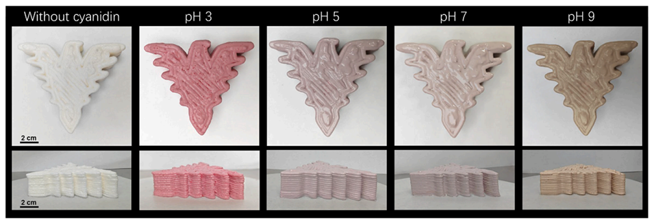 图7.pH变色3D打印双乳液凝胶的俯视图和侧视图;将W相的pH从3调节至9。