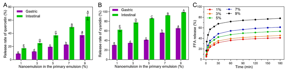 图8.模拟胃肠消化后槲皮素(A)和花青素(B)的释放;模拟肠道消化过程中FFA(游离脂肪酸)的释放(C)。