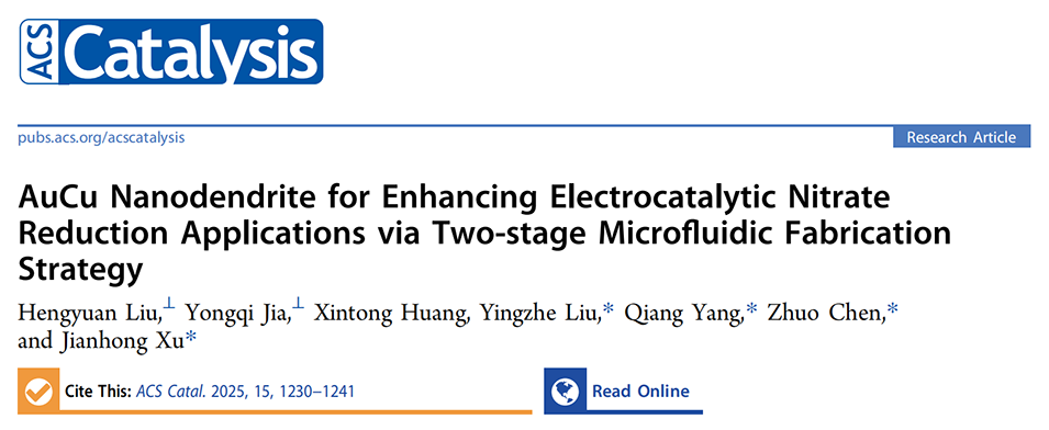 近期,清华大学徐建鸿教授、助理研究员陈卓联合华东理工大学杨强教授与厦门理工学院Yingzhe Liu等人,开发出一种创新的两阶段微流控制备策略,用于可控合成AuCu纳米枝晶,以提高电催化硝酸盐还原反应的性能。相关研究以“AuCu Nanodendrite for Enhancing Electrocatalytic Nitrate Reduction Applications via Two-stage Microfluidic Fabrication Strategy”为题目,发表在期刊《ACS Catalysis》上。