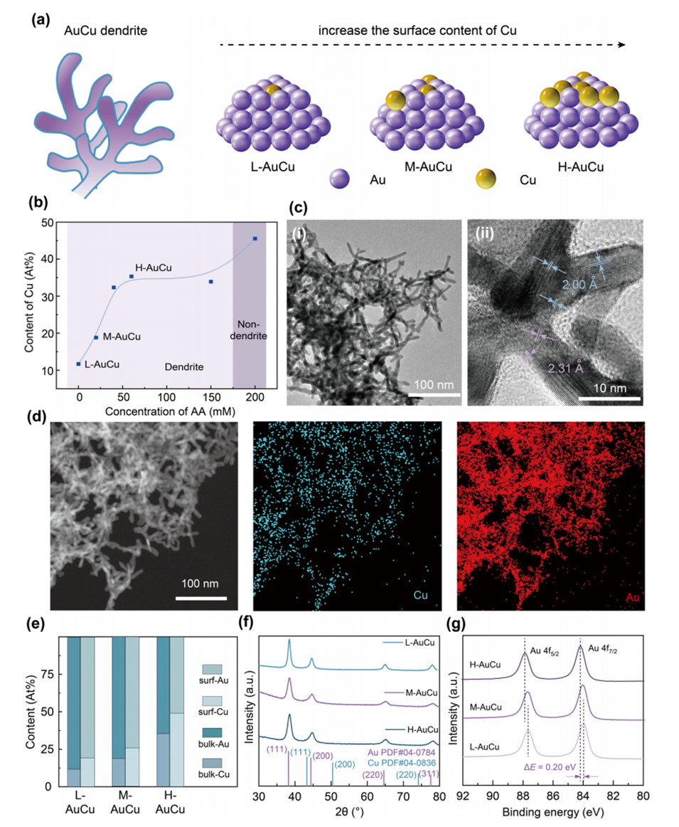 电催化硝酸盐还原反应(NitrRR)是将硝酸盐转化为氨的重要过程,对于清洁氨的生产具有重要意义。然而,该反应涉及复杂的八电子转移过程,导致反应选择性和动力学性能不佳,限制了其应用。近年来,树枝状金属合金作为高效催化剂受到了广泛关注,其中AuCu合金因其优异的电子和离子导电性而被认为具有很大的应用潜力。然而,目前在AuCu合金的制备过程中,还存在结构调控难度大和反应增强机制不明确等挑战。因此,开展高效、可控的合成策略以优化AuCu纳米材料的性能,对于提高NitrRR的催化效率至关重要。