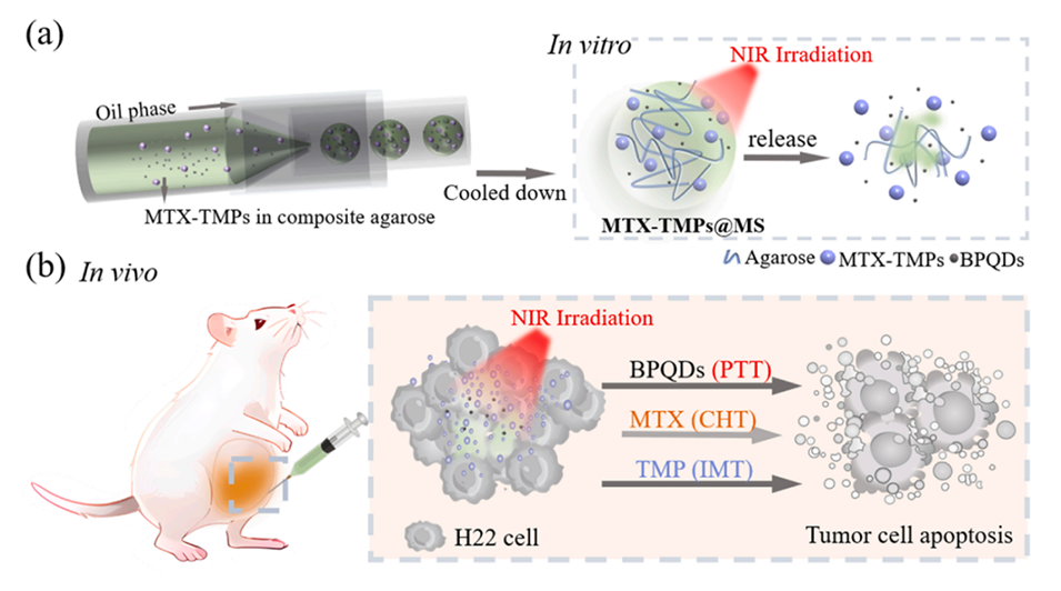 3、在近红外(NIR)诱导的热刺激下,MTX-TMPs可以从低熔点琼脂糖基质水凝胶微球中可控地释放出来,用于化疗(CHT)和免疫治疗(IMT)。