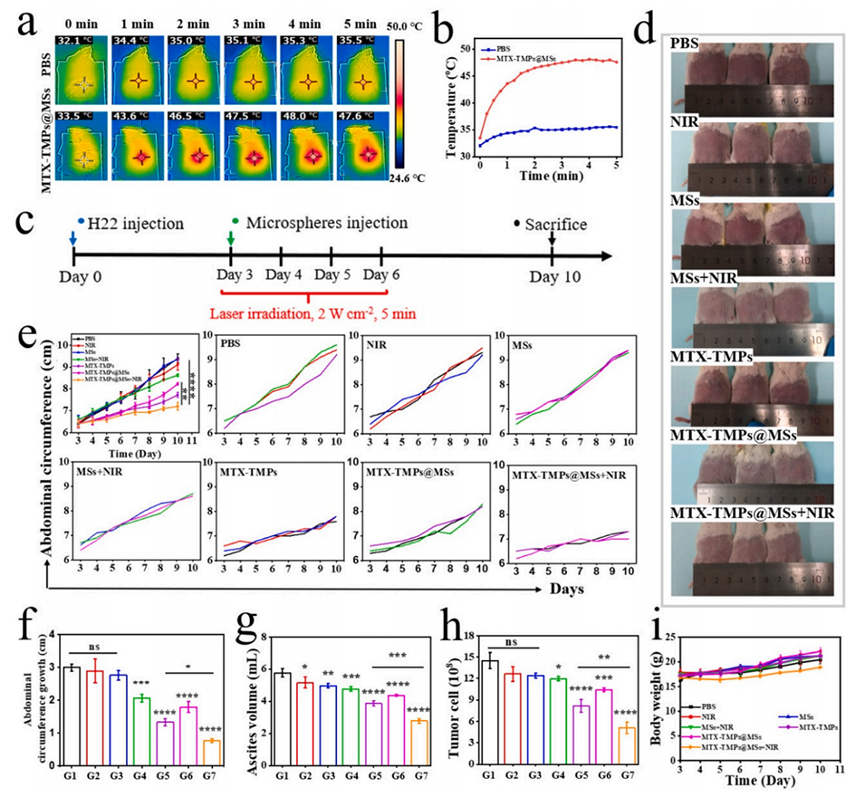 一方面,水凝胶微球中MTX-TMPs的释放可以通过黑磷量子点(BPQDs)介导的光热刺激按需控制。另一方面,BPQDs介导的光热治疗与MTX-TMPs诱导的化疗配合可参与重塑肿瘤免疫抑制微环境。相关研究以“Stimuli-responsive hydrogel microspheres encapsulated with tumor-cell-derived microparticles for malignant ascites treatment”为题目,发表在期刊《Acta Biomaterialia》上。